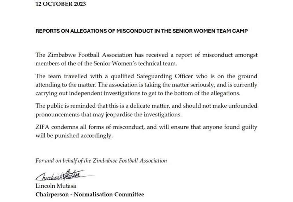 โThe Zimbabwe Football Association has received a report of misconduct amongst members of the Senior Womenโs technical team.